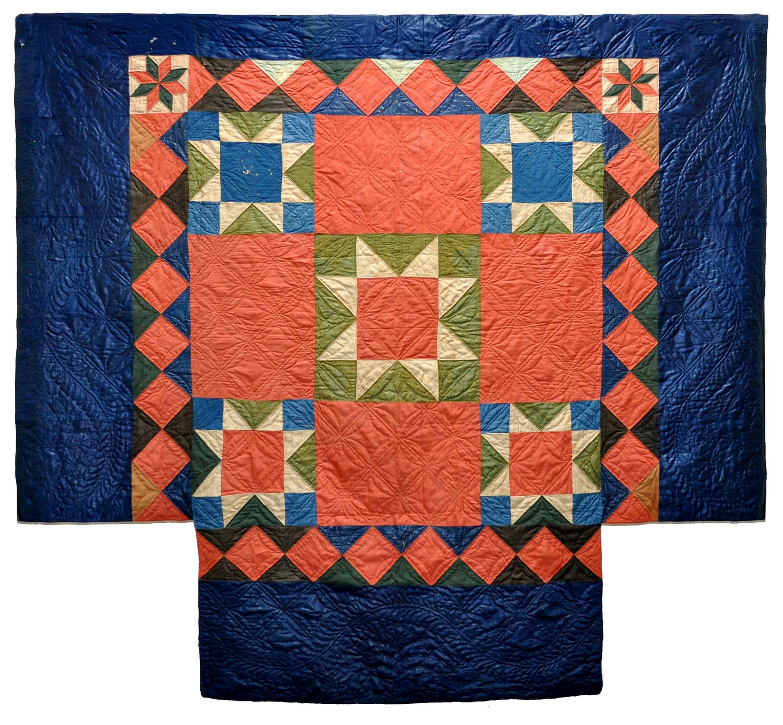 All solid fabrics, the center panel is bordered on four sides with a harlequin-like design made of watermelon colored squares and multicolored half squares. The cornerstones are eight-pointed, LeMoyne stars, and the side flaps are brilliant royal with feather vine quilting. The quilting design also includes a four-petaled, elliptical botanical design with two rows of quilting running through the center of each of the four connected ellipses. I've seen a similar quilting design with the elliptical shapes called pumpkin seed, but these may look more like laurel leaves. The quilt has a plain light/white back fabric and a knife-edge binding.